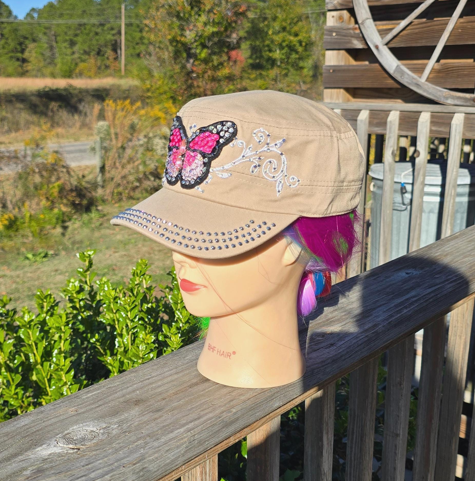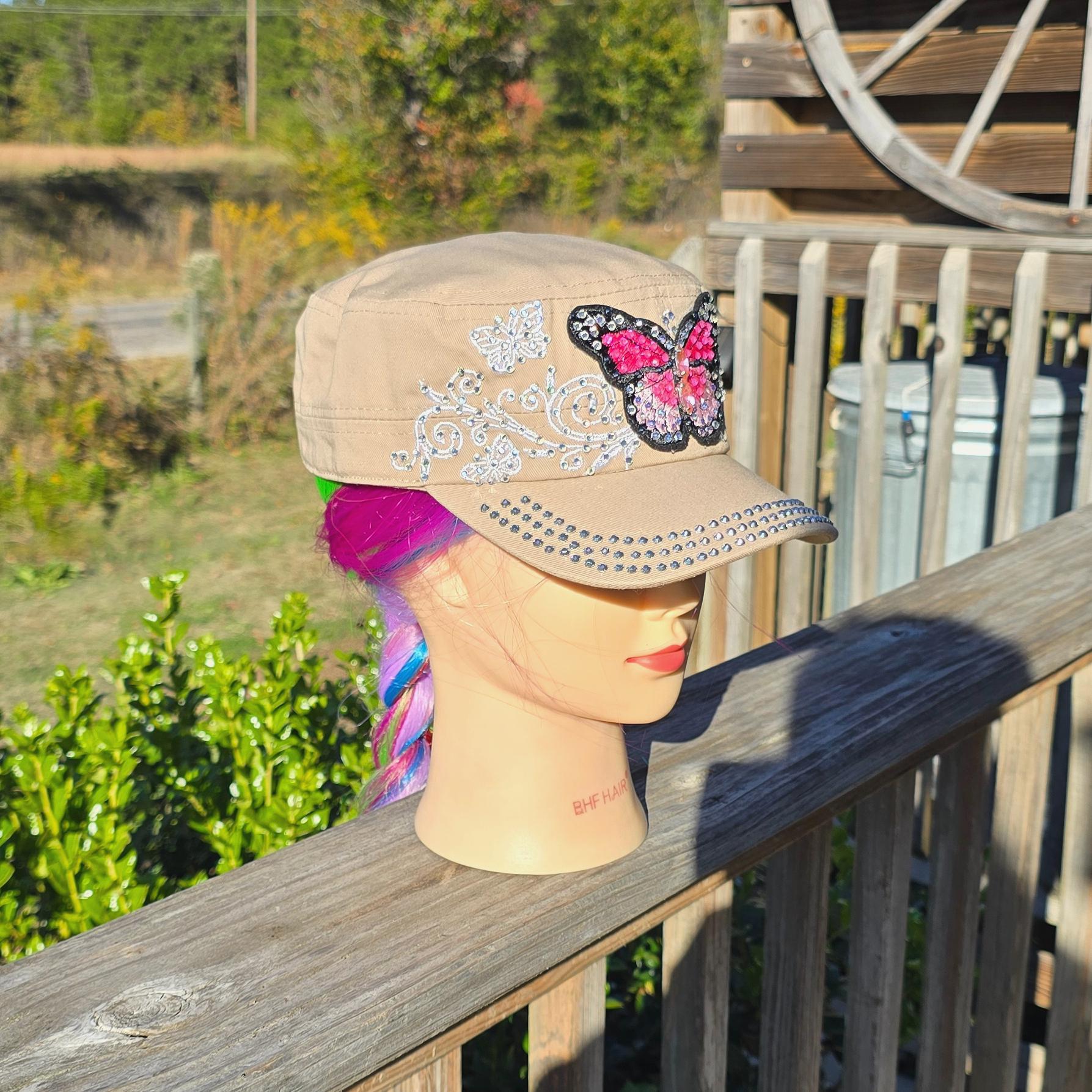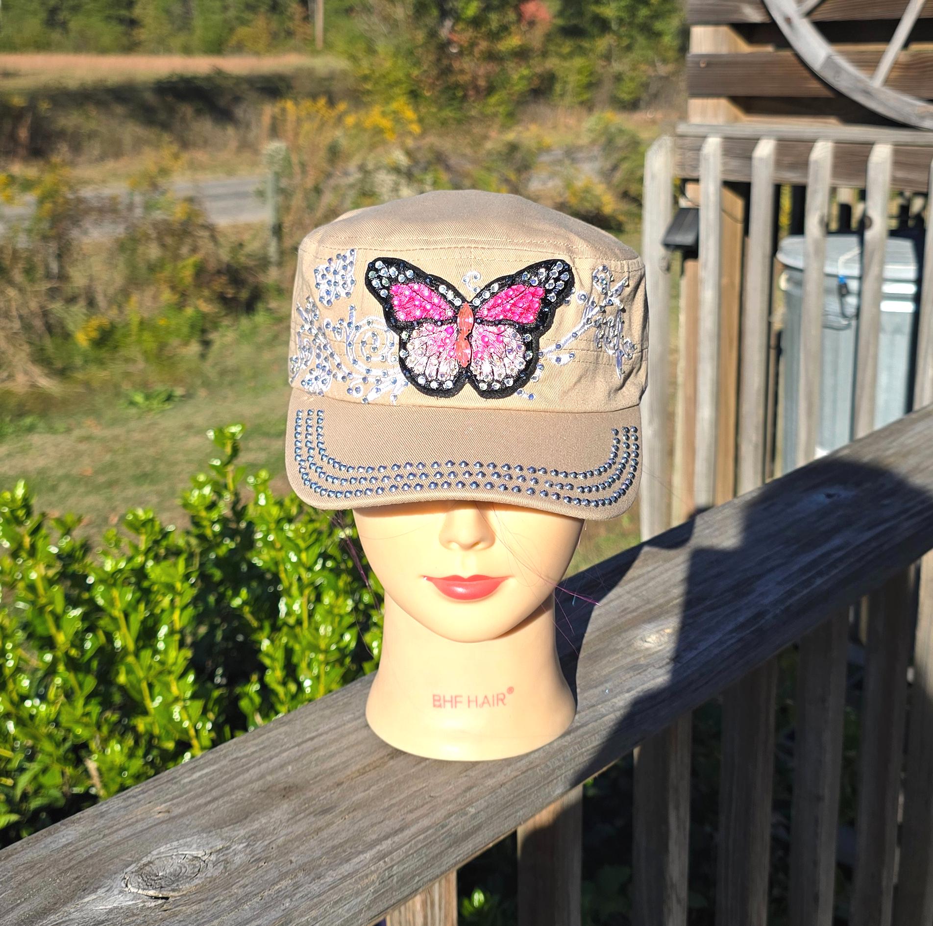 Ladies Khaki & Pink Butterfly BLING hat