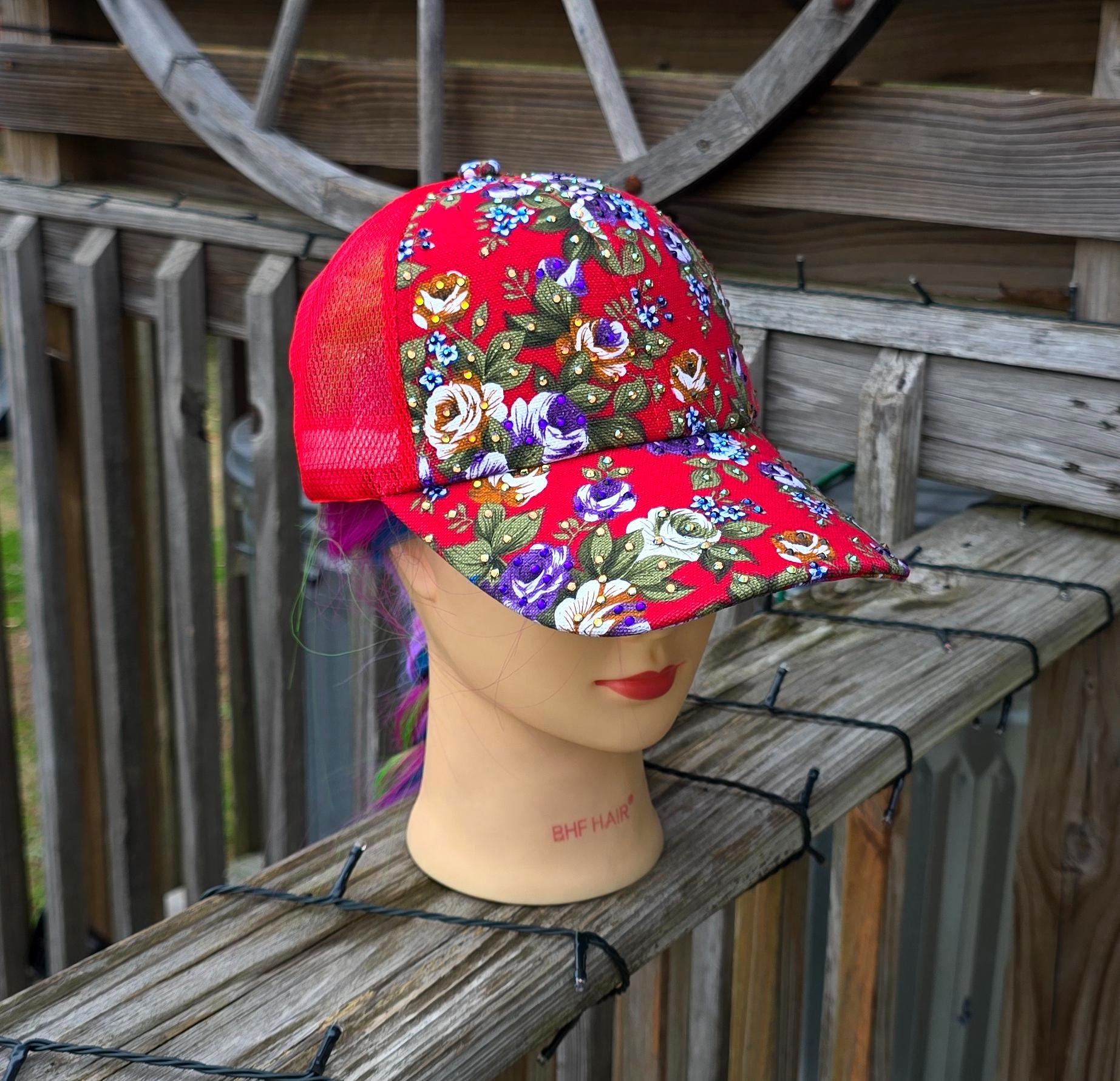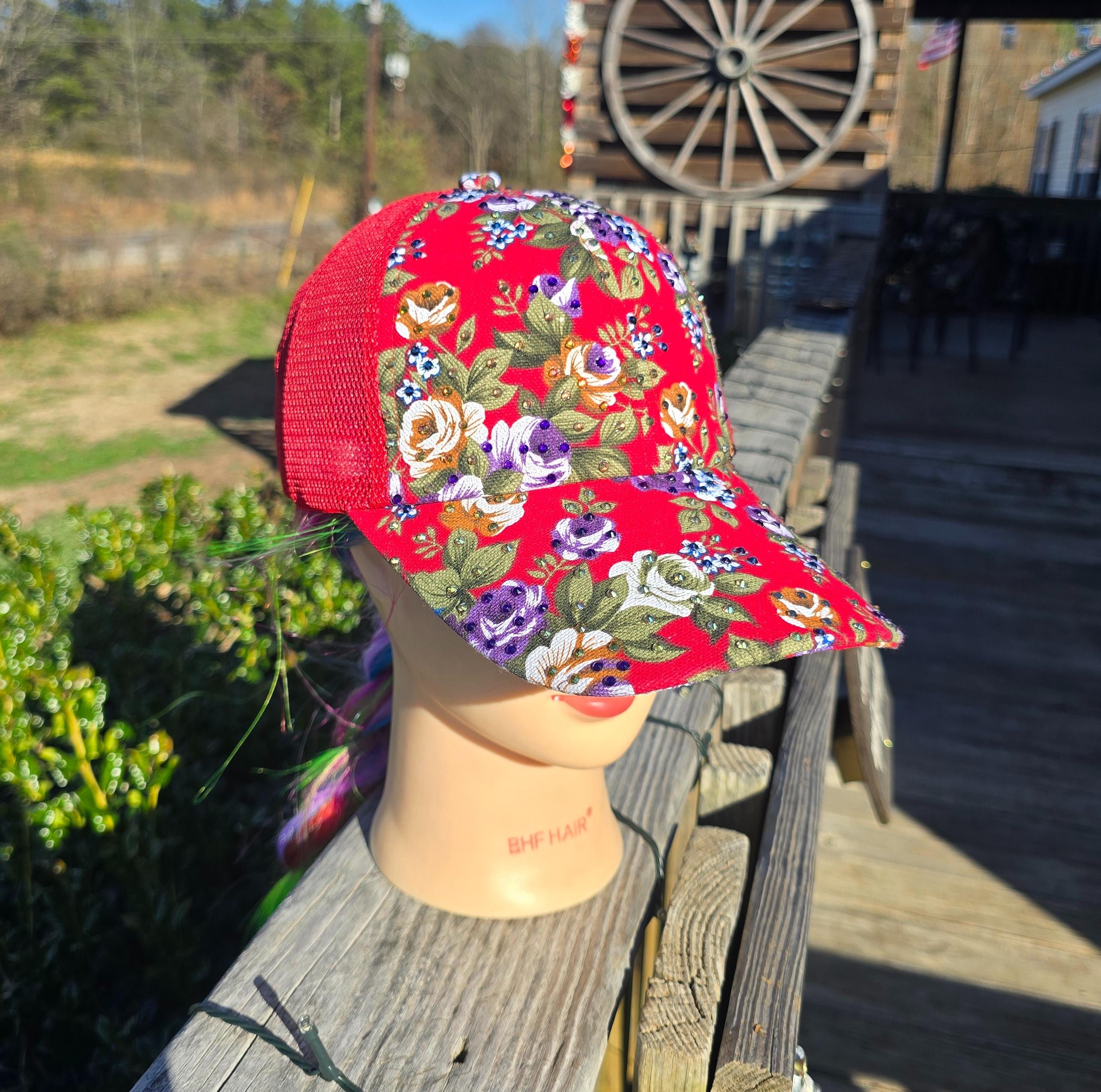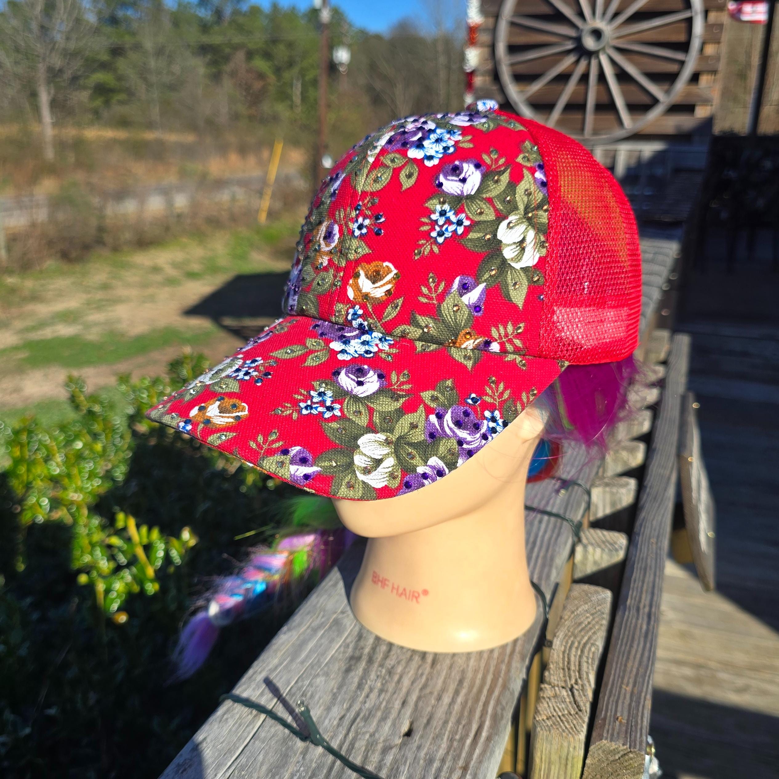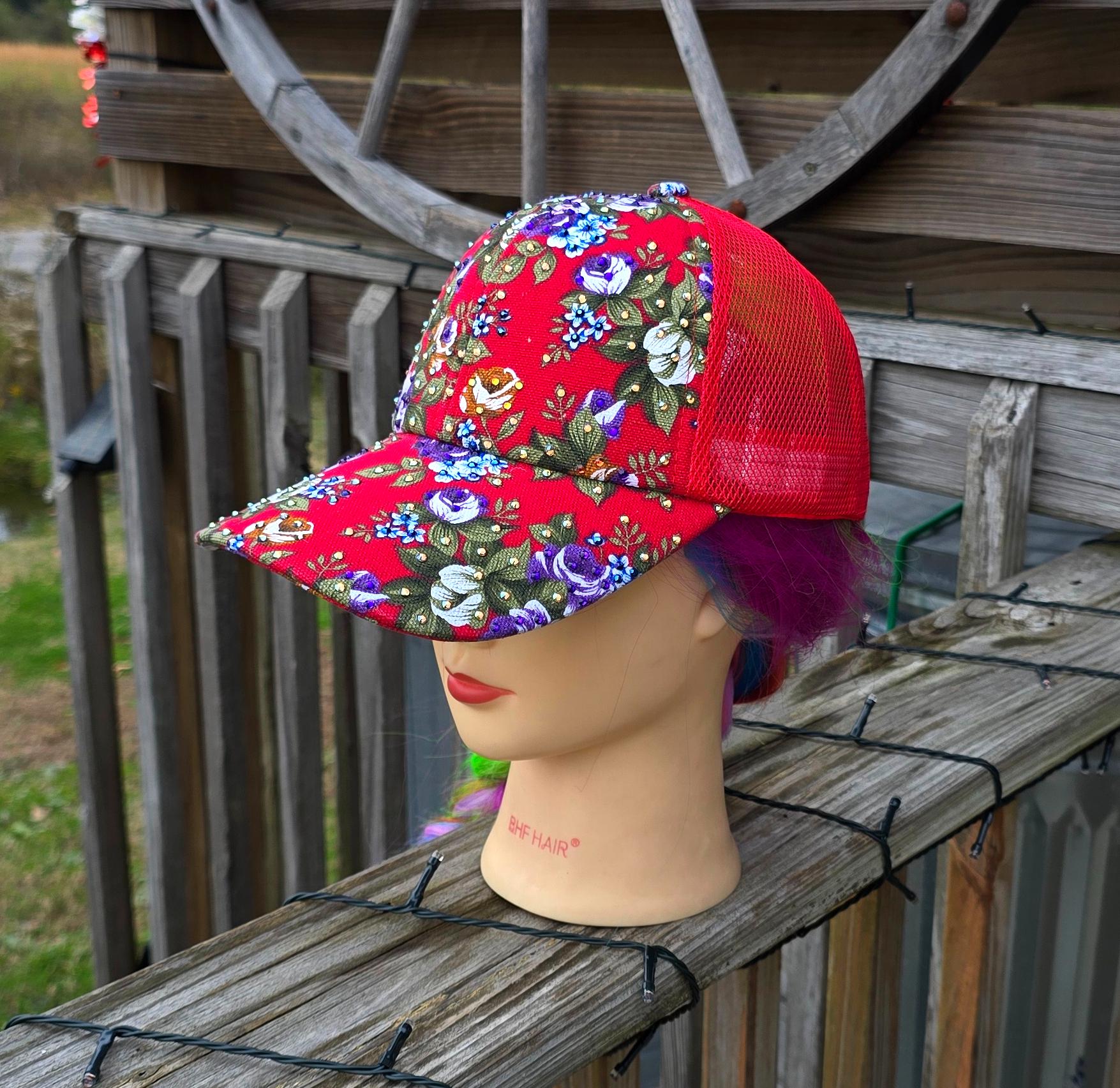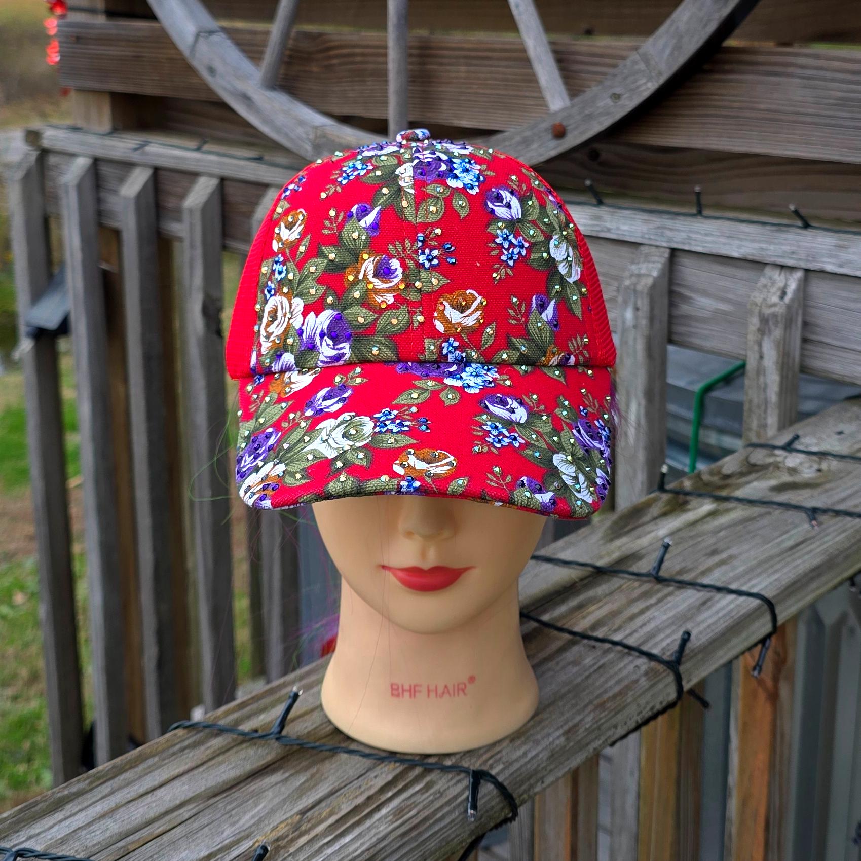 Ladies Red Flower Trucker BLING Hat